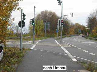 Lt. Landesbetrieb Straßen NRW, NL Euskirchen (23.06.09, 13:45) hat der Signalplaner/-bauer – warum auch immer – die Kopplung bei Schwachlastzeiten, also schnellen Umläufen nicht gesetzt. Dem widerspricht allerdings nicht nur die eigene Beobachtung am Freitag, 19.06.09, gegen 15 Uhr bei hohem Verkehrsaufkommen und trotzdem ewig langen Wartezeiten, sondern auch ähnliche Feststellungen anderer RadfahrerInnen. Wie dem auch sei, die notwendigen Parameter (2 an der Zahl - für Schwach- und Starklast) sind inzwischen (24.06.09) gesetzt worden – hoffentlich auch das Verständnis für die Belange der nichtmotorisierten Verkehrsteilnehmer!